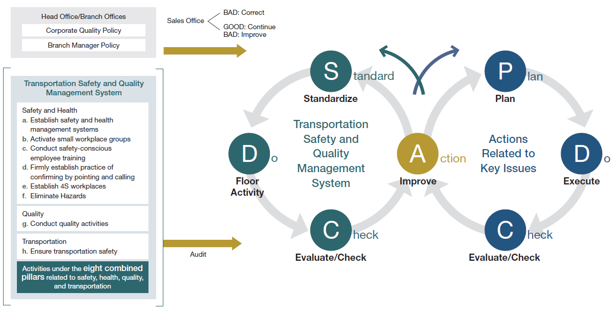 We conduct safety and quality activities based on the Corporate Quality Policy announced at the beginning of the year. Based on the Corporate Quality Policy of the Head Office, each sales office incorporates activities for the year into their operating plans, after which they proceed with the activities through the SDCA cycle. Once these improved methods are standardized into SDCA, the offices return to the SDCA cycle. In addition to the abovementioned daily safety activities, the Head Office Safety/ Quality Department and each corporate quality specialist and individual in charge work together to tackle individual issues each year. In FY3/2025, we continued our efforts from the previous year, working to reinvigorate initiatives concerning near-accidents. Each corporate quality specialist or individual in charge selected a location under their jurisdiction for 4M5E analysis of factors interfering with near-accident initiatives. Each specialist and individual in charge worked together with the Head Office Safety/Quality Department via web conference to check progress, including progress on items noted in the work process chart. In principle, safety and quality activities are carried out under the direction of each general manager, branch manager, and sales office manager in order. However, each corporate quality specialist or other individual in charge assigned to a branch or affiliate receives individual support from the Corporate/Quality Division and provides support for the activities at each sales office.