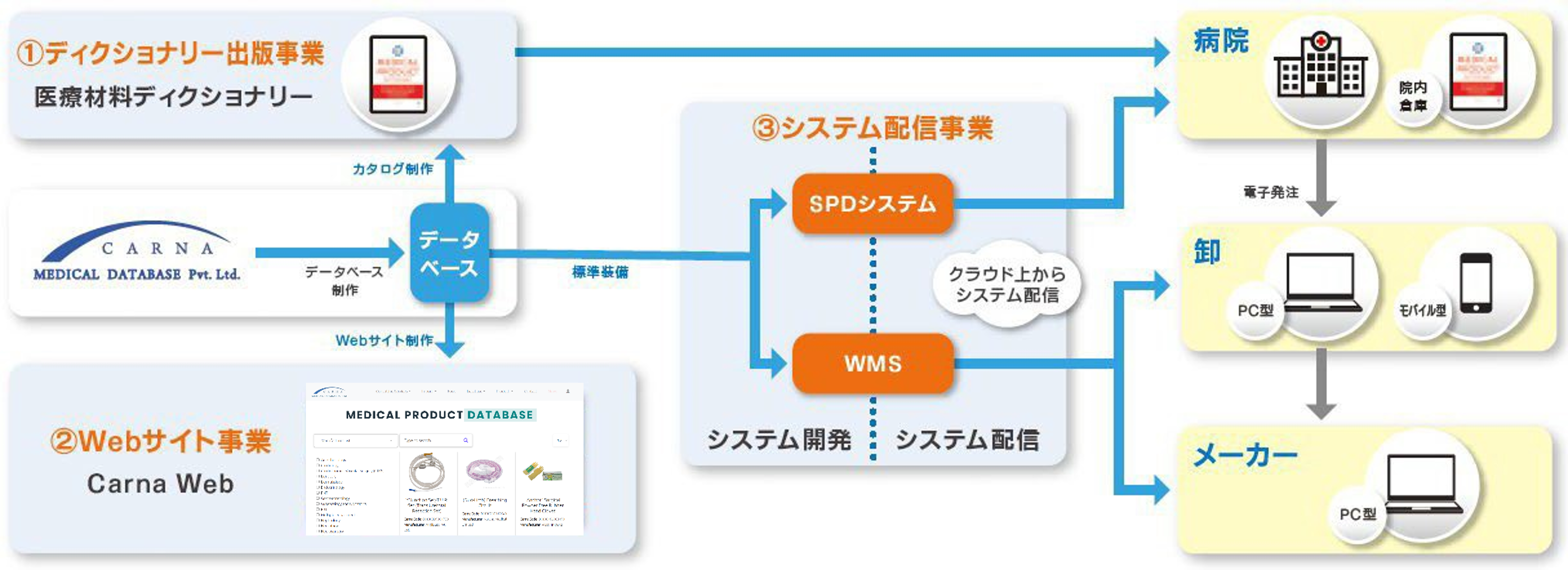 医療材料(約200メーカー、49,000アイテム)をデータベース化し、医療材料ディクショナリとして発刊(その内10,000アイテムを掲載)インド全国約8,000の病院に配布しています。掲載された製品にはインド初の試みとしてすべて二次元バーコードを付与し、医療の情報インフラを開発。現在*までに、病院データベース50,000病院、医師データベース75,000人の情報を保有しています。当社は3つの情報基盤を活用し、インドの医療材料、医薬品物流の整備と、病院と医師のデータを掛け合わせたCarna Medical Database Pvt. Ltd.独自のご提案で日本の医療関連企業の進出に貢献していきます。